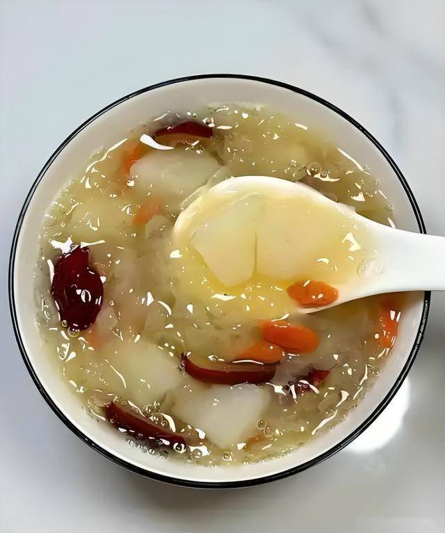 7. 加入枸杞:最后加入泡软的枸杞,轻轻搅拌,继续炖煮5分钟,使枸杞的营养成分充分融入汤中。可以根据个人喜好加入一些干贝或龙眼干提升风味。